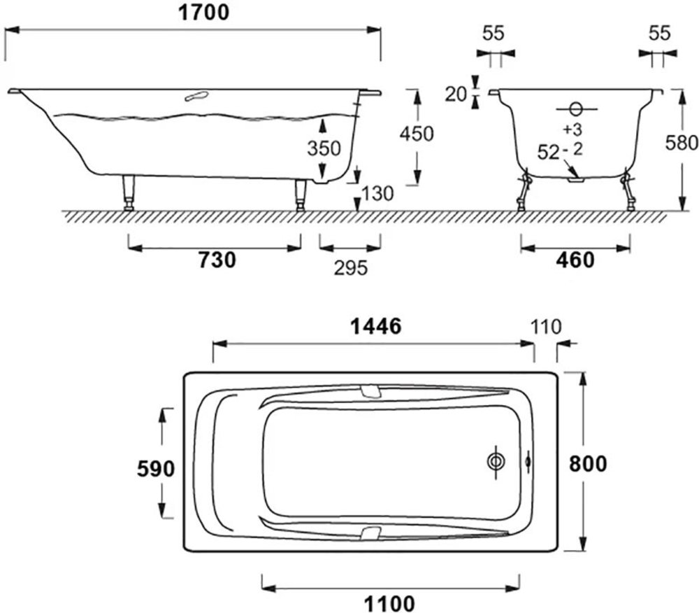 Чугунная ванна Jacob Delafon Repos, 170 x 80 см, без отверстий для ручек и антискользящего покрытия, ножки и слив-перелив в подарок, E2918-S-00