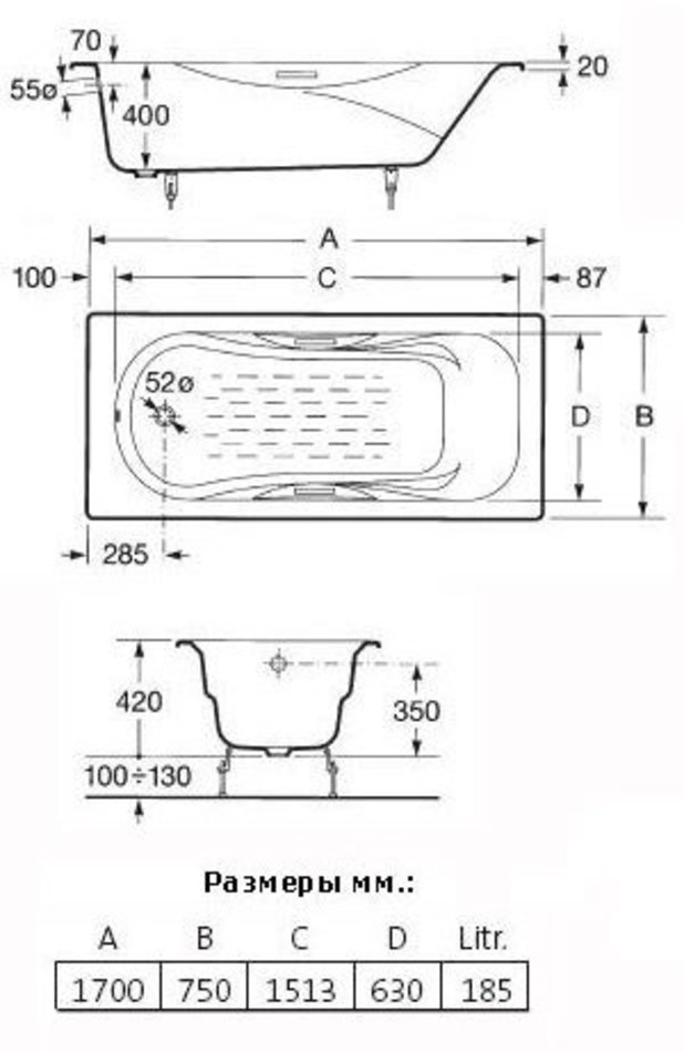Чугунная ванна Roca Malibu 170 х 75 с ручками 2309G000R, с опорами, цвет белый, 7.2309.G.000.R/7.5268.0.301.0/7.1504.1.233.0