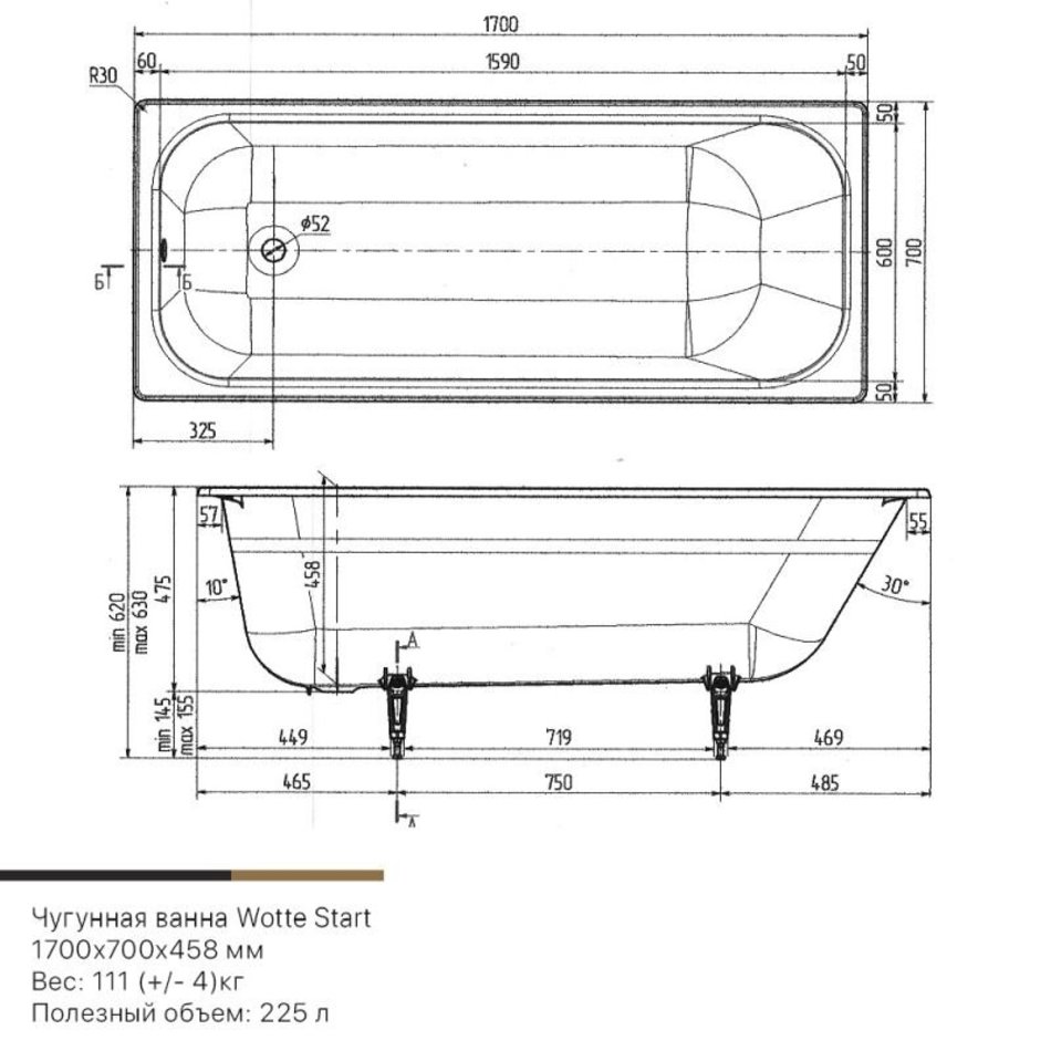 Чугунная ванна Wotte Start 170 х 70 см, белая, БП-э00д1139