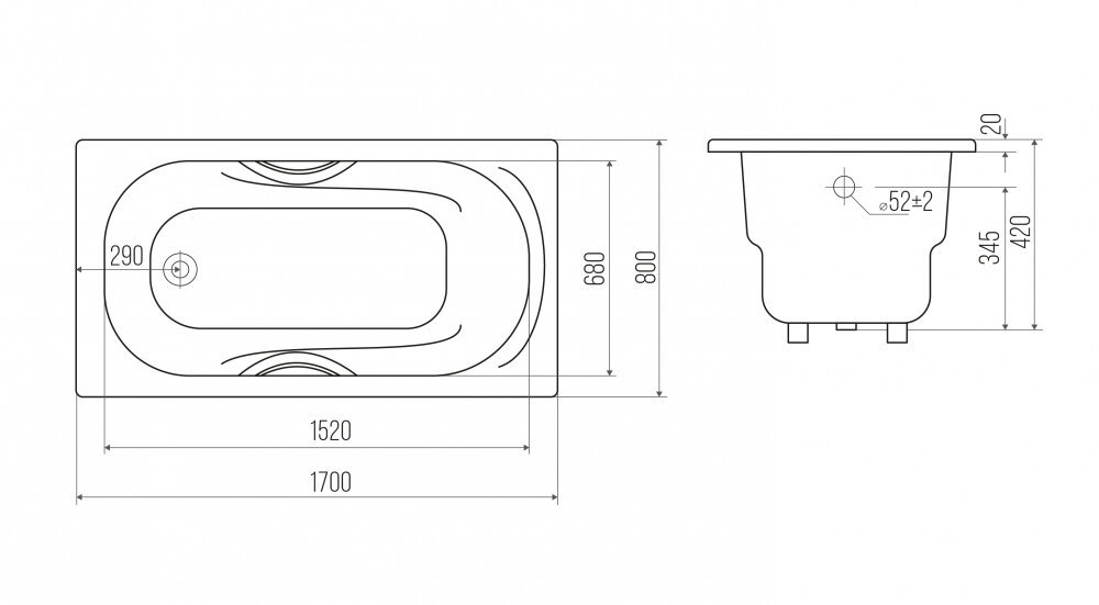 Ванна чугунная Goldman Nova, 170 х 80 см, с отверстиями для ручек, белая, NV17080H