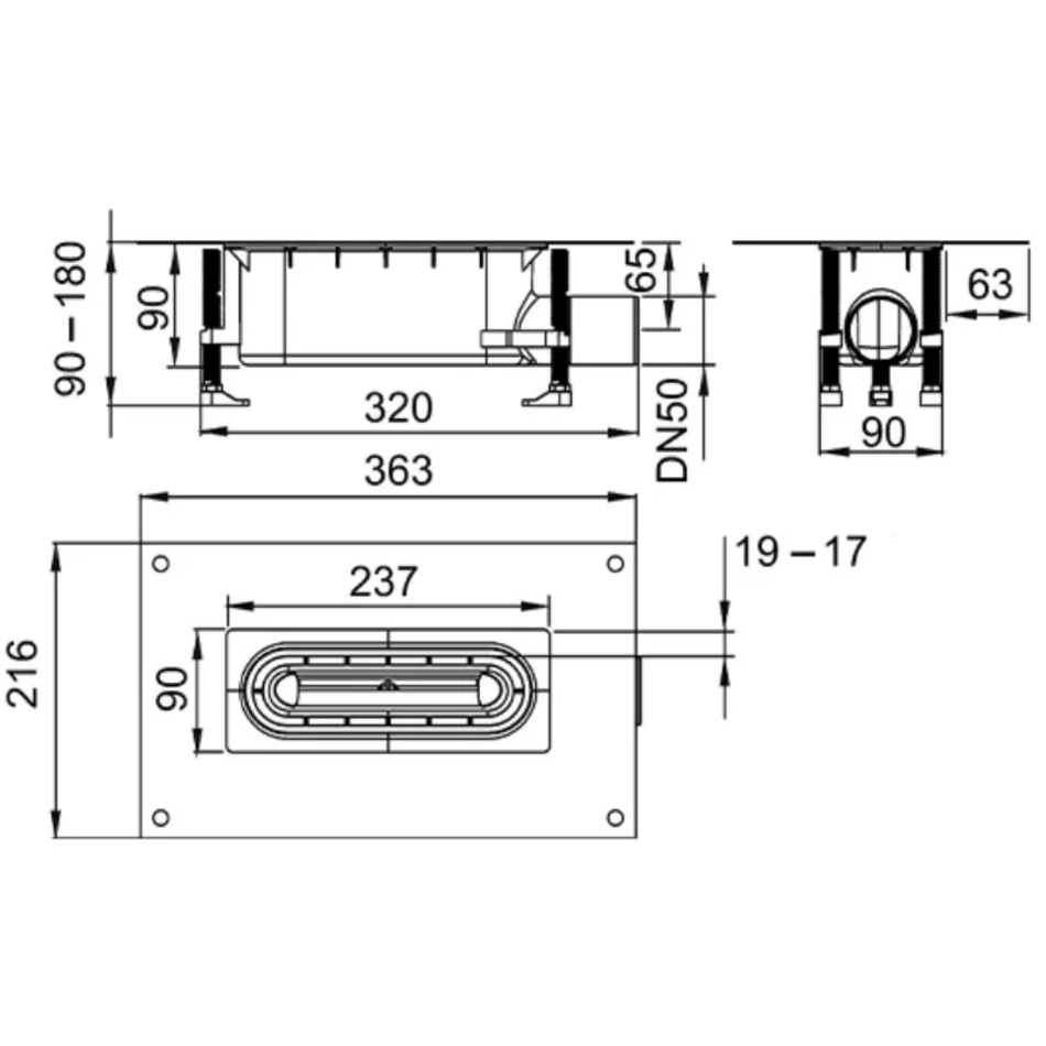 - Монтажная высота от 90 до 180 мм (от нижней кромки сифона до верхней поверхности бетонной стяжки)