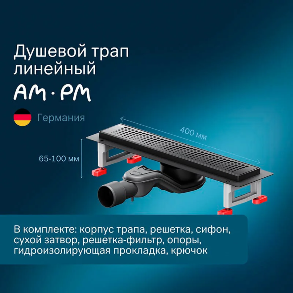В комплекте душевого трапа 40 AM.PM MasterFlow W01SC-P11-040-01BM: корпус трапа, декоративная решетка, поворотный сифон, сухой магнитный затвор, решетка-фильтр, регулируемые опоры, гидроизолирующая прокладка, крючок для легкого снятия декоративной решетки, защитный вкладыш для защиты лотка во время монтажа, комплект крепежа.