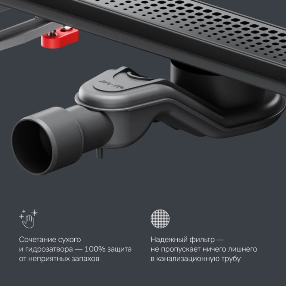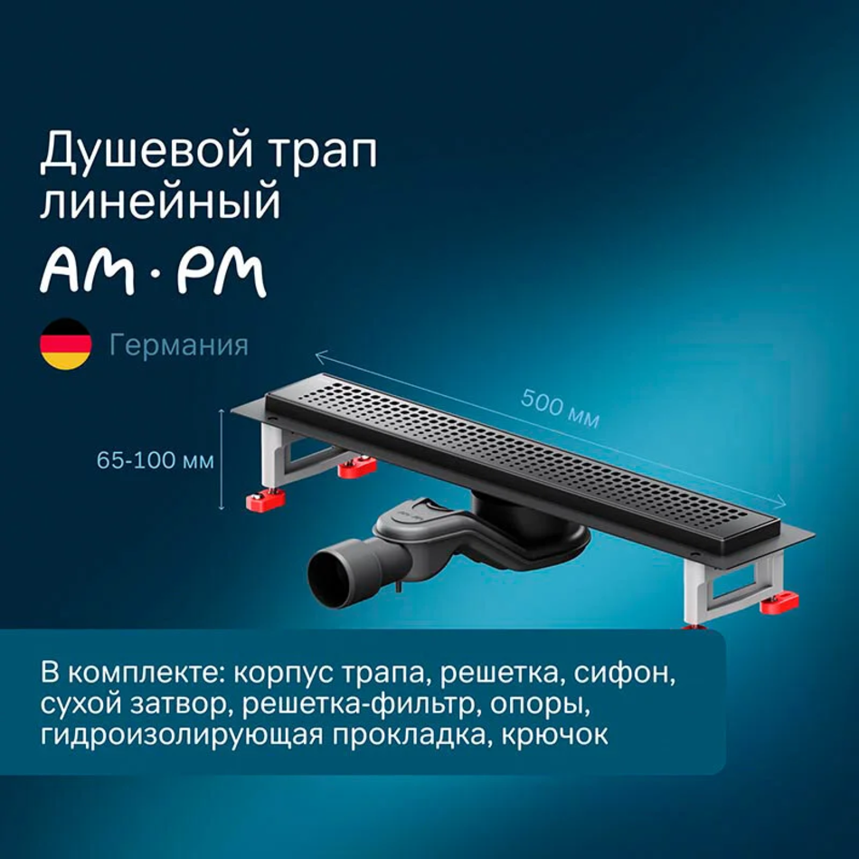 В комплекте душевого трапа 50 AM.PM MasterFlow W01SC-P11-050-01BM: корпус трапа, декоративная решетка, поворотный сифон, сухой магнитный затвор, решетка-фильтр, регулируемые опоры, гидроизолирующая прокладка, крючок для легкого снятия декоративной решетки, защитный вкладыш для защиты лотка во время монтажа, комплект крепежа.