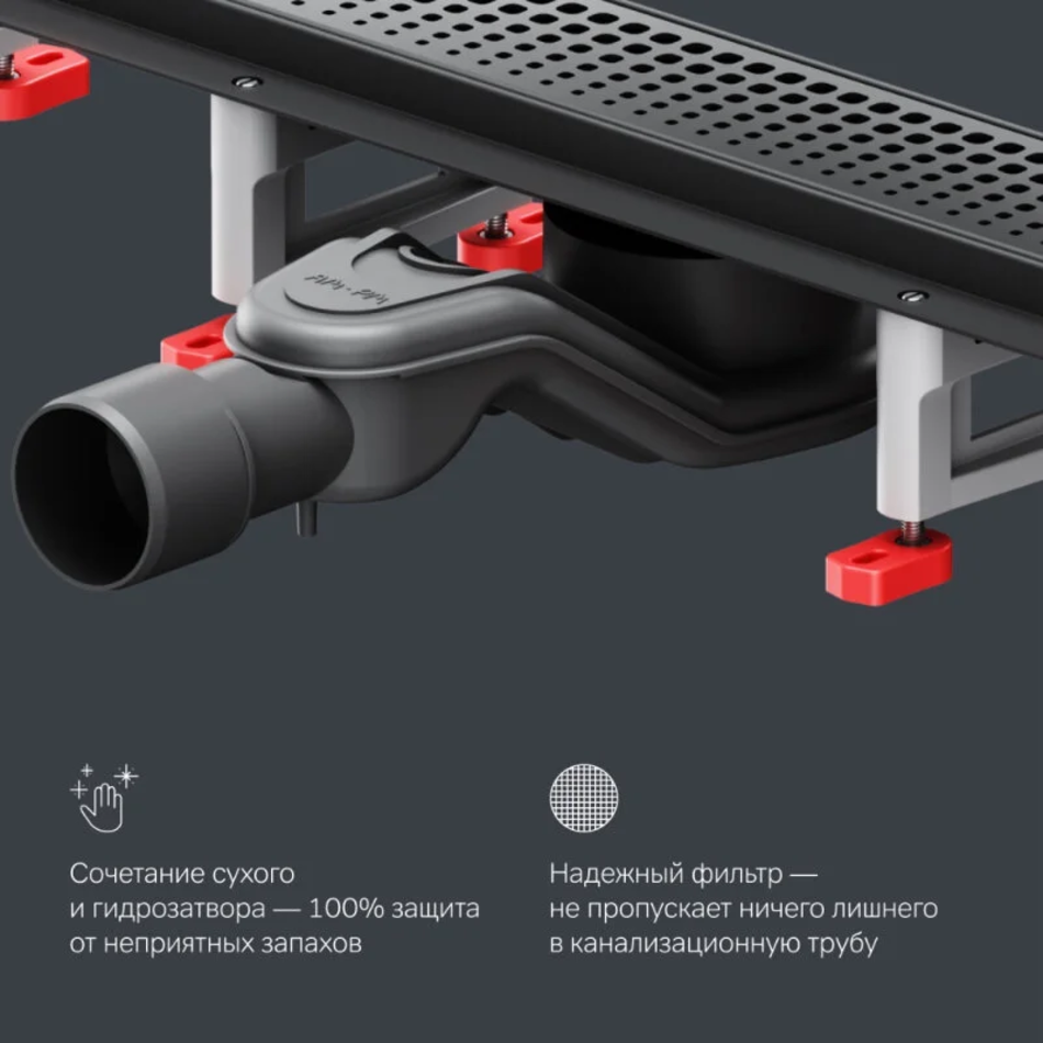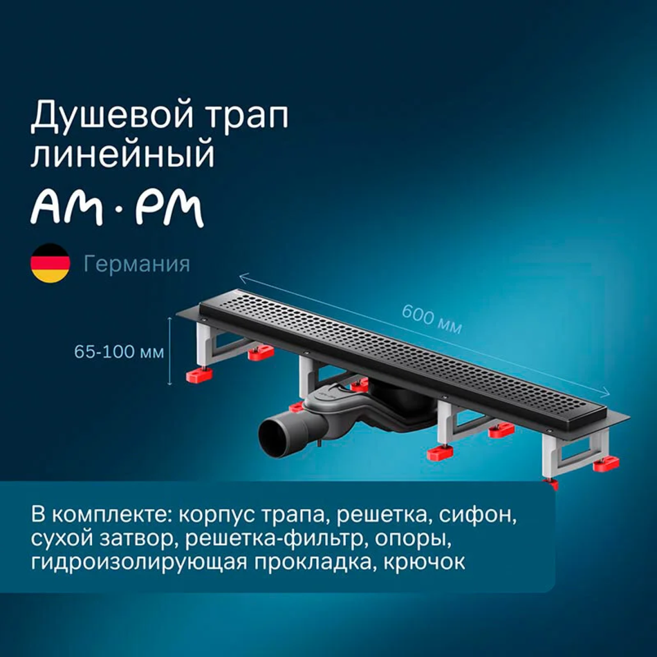 В комплекте душевого трапа 60 AM.PM MasterFlow W01SC-P11-060-01BM: корпус трапа, декоративная решетка, поворотный сифон, сухой магнитный затвор, решетка-фильтр, регулируемые опоры, гидроизолирующая прокладка, крючок для легкого снятия декоративной решетки, защитный вкладыш для защиты лотка во время монтажа, комплект крепежа.