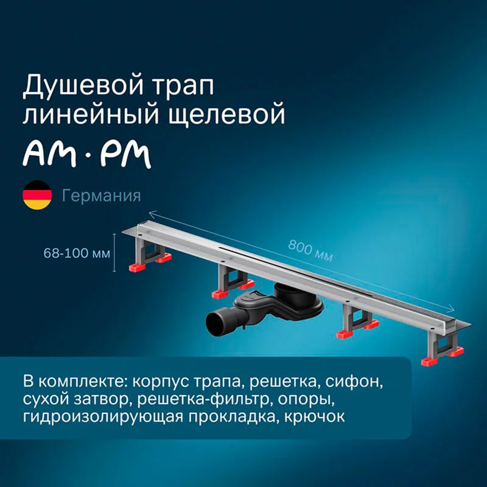 В комплекте душевого трапа 80 AM.PM MasterFlow W01SC-S11-080-05SB: корпус трапа, декоративная решетка, поворотный сифон, сухой затвор, уплотнительное кольцо-переходник, решетка-фильтр, регулируемые опоры, гидроизолирующая прокладка, крючок для легкого снятия декоративной решетки, защитный вкладыш для защиты лотка во время монтажа, комплект крепежа.