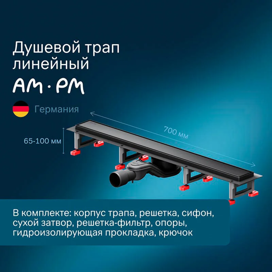 В комплекте душевого трапа 70 AM.PM MasterFlow W01SC-U11-070-04BM: корпус трапа, декоративная решетка, поворотный сифон, сухой магнитный затвор, решетка-фильтр, регулируемые опоры, гидроизолирующая прокладка, крючок для легкого снятия декоративной решетки, защитный вкладыш для защиты лотка во время монтажа, комплект крепежа.