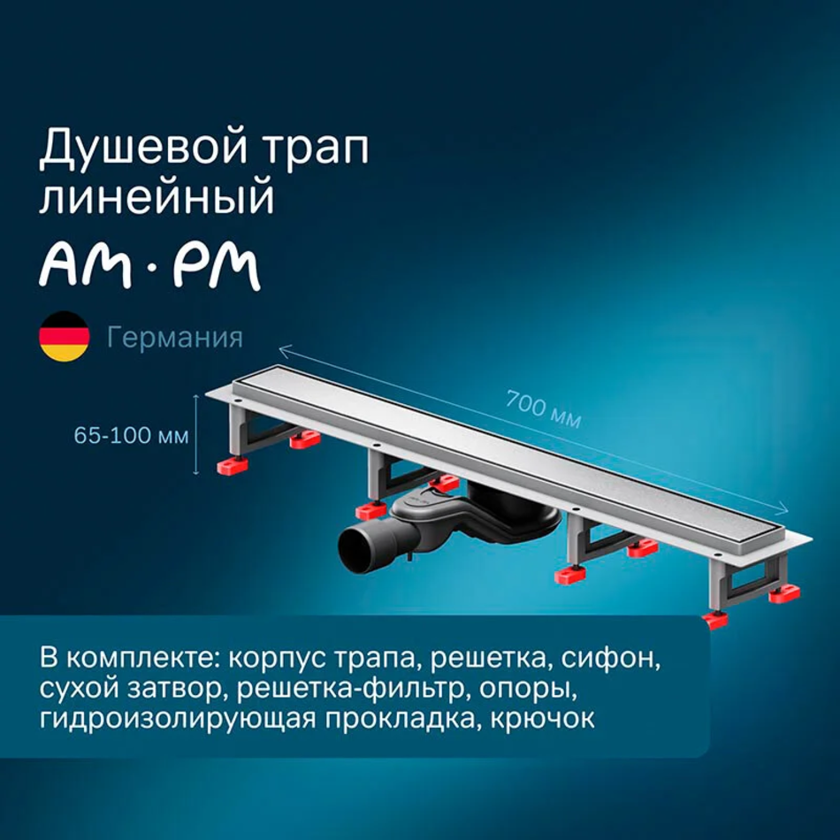 В комплекте душевого трапа 70 AM.PM MasterFlow W01SC-U11-070-04SB: корпус трапа, декоративная решетка, поворотный сифон, сухой магнитный затвор, решетка-фильтр, регулируемые опоры, гидроизолирующая прокладка, крючок для легкого снятия декоративной решетки, защитный вкладыш для защиты лотка во время монтажа, комплект крепежа.