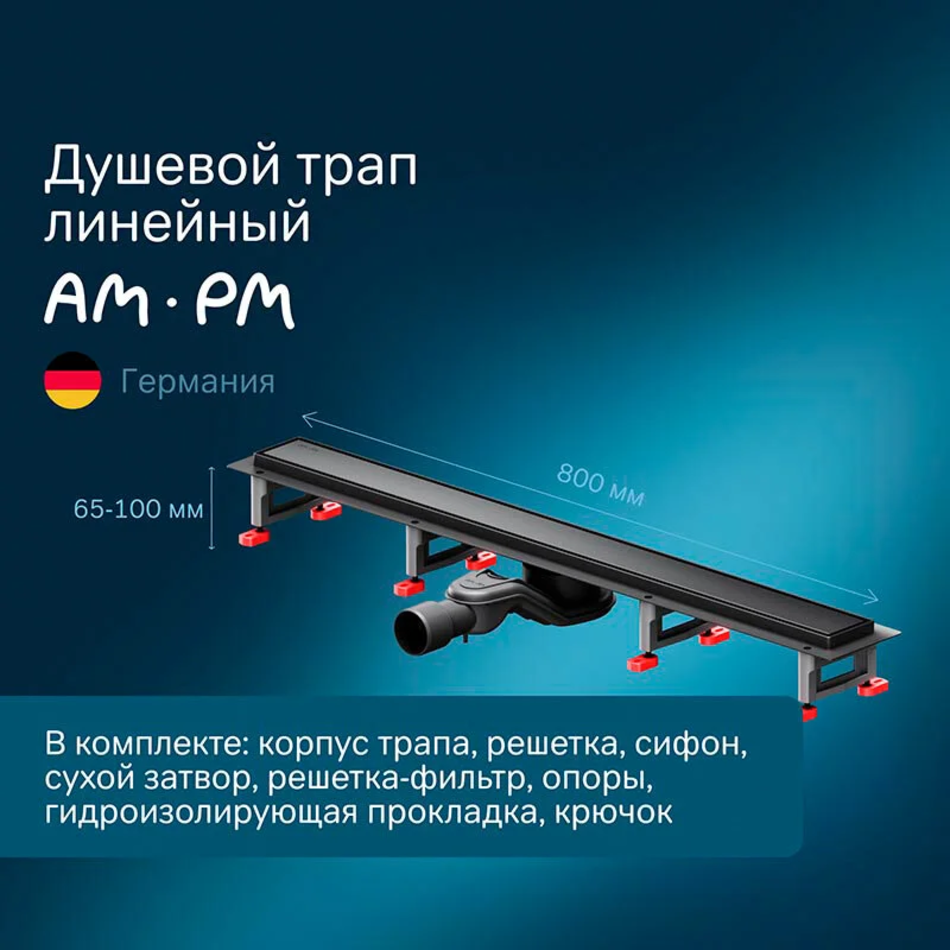 В комплекте душевого трапа 80 AM.PM MasterFlow W01SC-U11-080-04BM: корпус трапа, декоративная решетка, поворотный сифон, сухой магнитный затвор, решетка-фильтр, регулируемые опоры, гидроизолирующая прокладка, крючок для легкого снятия декоративной решетки, защитный вкладыш для защиты лотка во время монтажа, комплект крепежа.