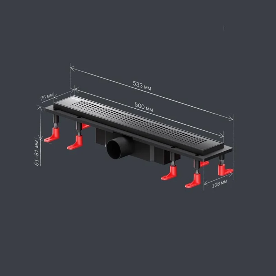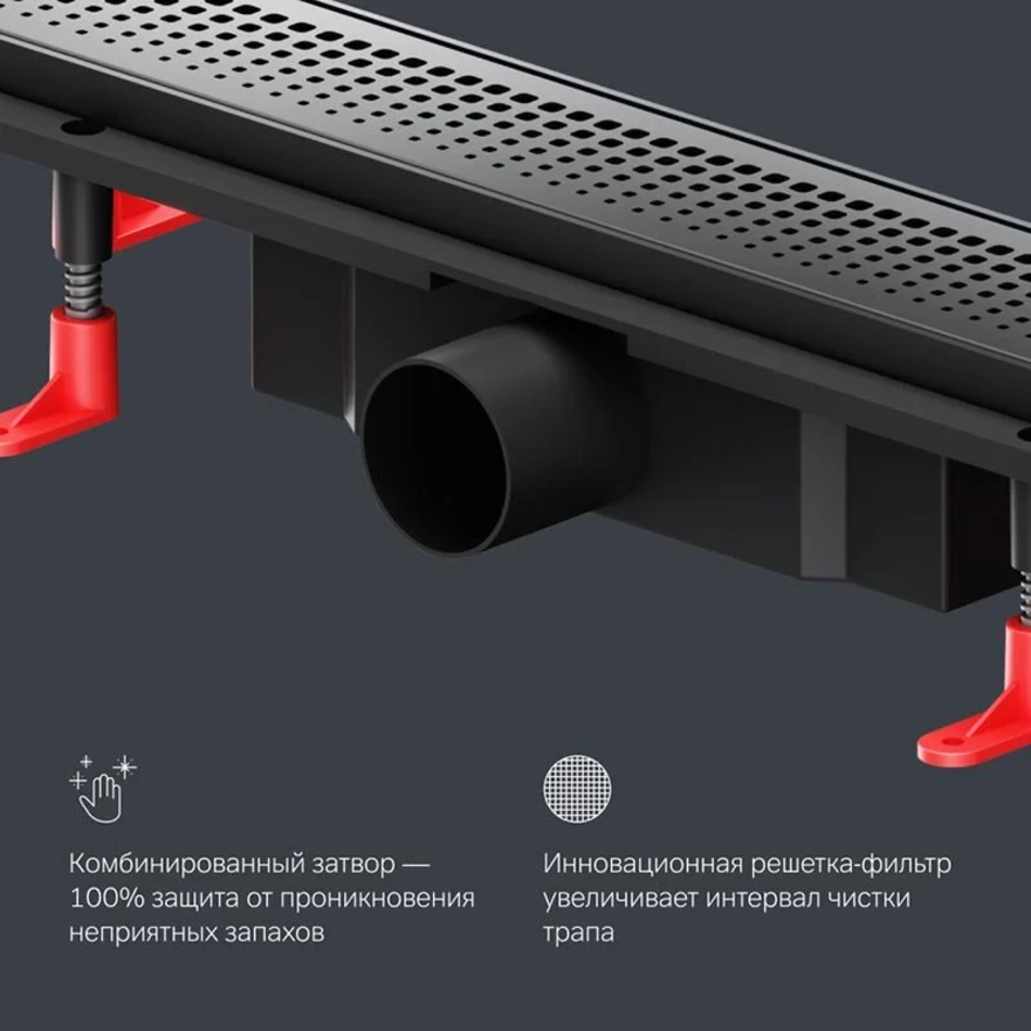 Продукт обладает низкой высотой монтажа и возможностью регулировки, что предполагает экономию бюджета при заливке пола. Трап имеет инновационную конструкцию решетки с фильтром, что значительно увеличивает межсервисный интервал.