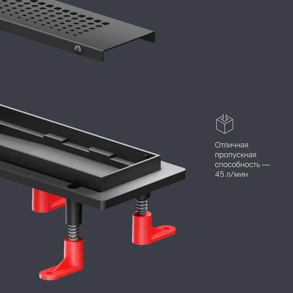 Продукт обладает низкой высотой монтажа и возможностью регулировки, что предполагает экономию бюджета при заливке пола. Трап имеет инновационную конструкцию решетки с фильтром, что значительно увеличивает межсервисный интервал.