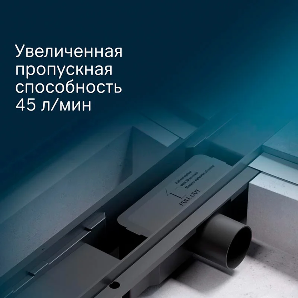 Невероятно высокая скорость слива — 45 л/мин благодаря двухкамерному комбинированному затвору. Надежность и долговечность изделия. Легкое обслуживание трапа: простая разборка и чистка сифона.
