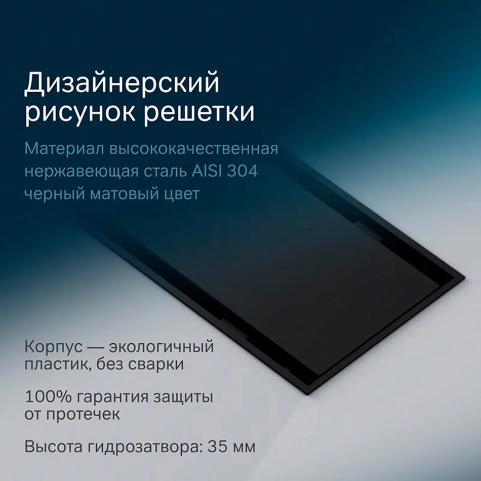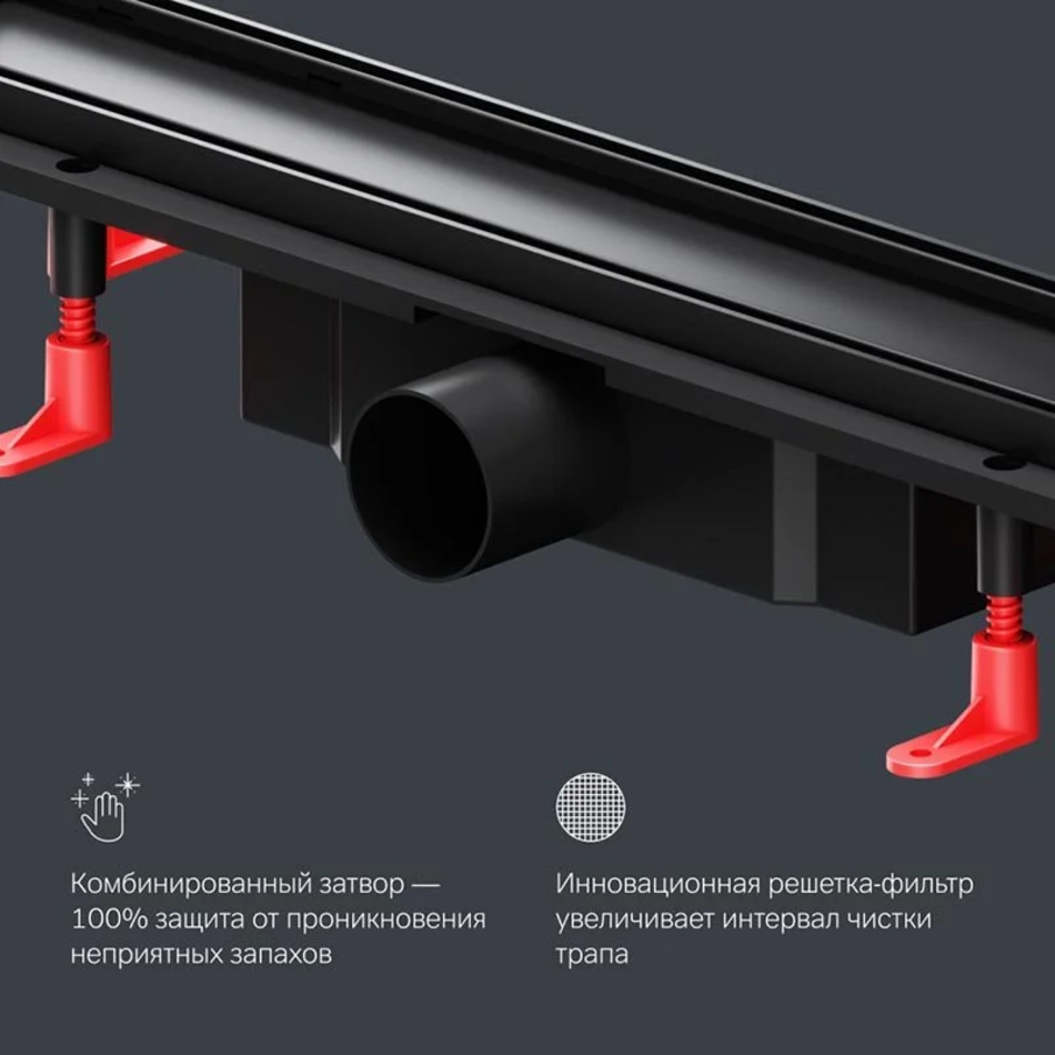 Продукт обладает низкой высотой монтажа и возможностью регулировки, что предполагает экономию бюджета при заливке пола. Трап имеет инновационную конструкцию решетки с фильтром, что значительно увеличивает межсервисный интервал.