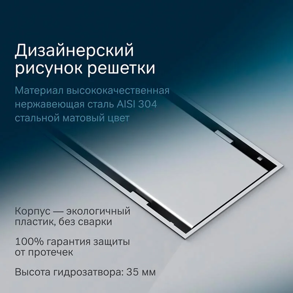 Продукт обладает низкой высотой монтажа и возможностью регулировки, что предполагает экономию бюджета при заливке пола. Трап имеет инновационную конструкцию решетки с фильтром, что значительно увеличивает межсервисный интервал.
