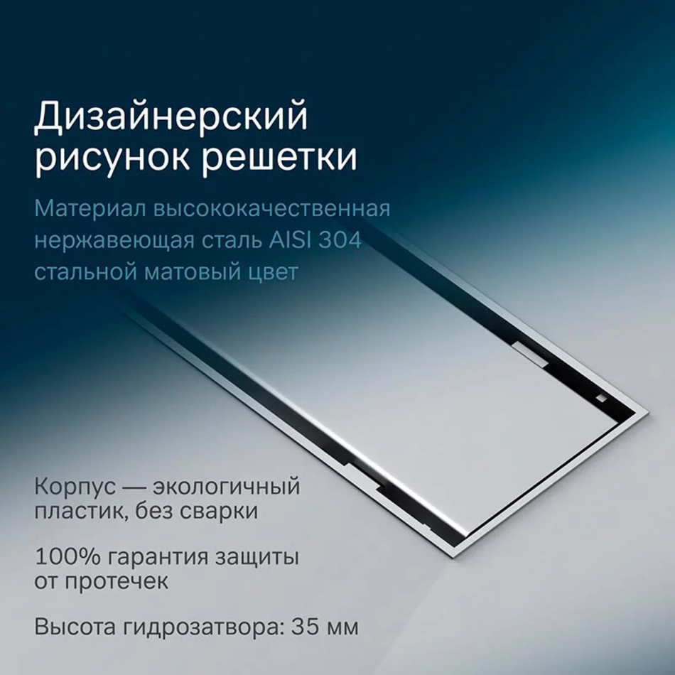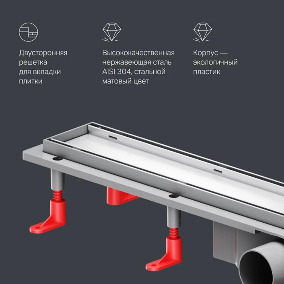 Продукт обладает низкой высотой монтажа и возможностью регулировки, что предполагает экономию бюджета при заливке пола. Трап имеет инновационную конструкцию решетки с фильтром, что значительно увеличивает межсервисный интервал.