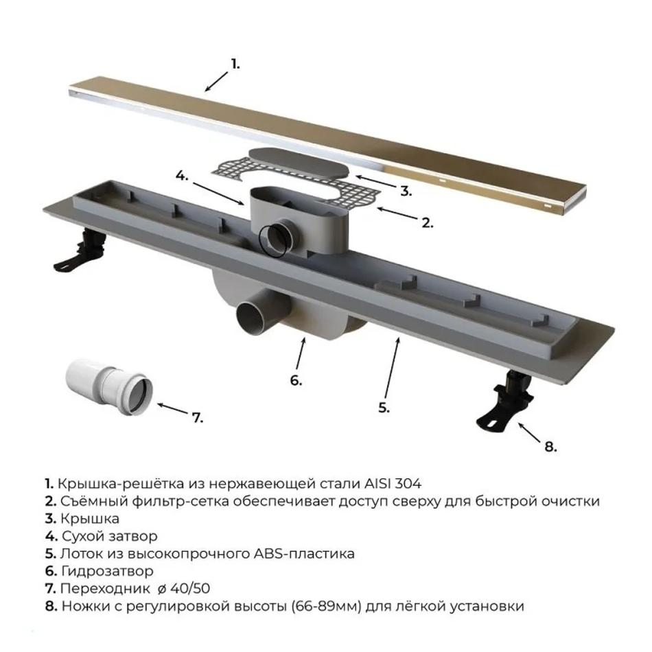 Душевой трап Leo-11 – это сантехническое изделие, созданное для отведения воды из зоны, душевого пространства, выложенное керамической плиткой или мозаикой. Модельный ряд представлен в трех вариантах длины: 40, 60 и 80 см. Трап укомплектован комбинированным затвором гидро+сухой затвор, такая конструкция позволяет на 100% исключить проникновение неприятного запаха в ванную комнату. Решётка выполнена из нержавеющей стали AISI 304, а лоток выполнен из высокопрочного ABS-пластика, такая конструкция обеспечивает максимальную надёжность конструкции более 10 лет. Решётка двухсторонняя-перевернув решётку в неё можно вложить плитку, что позволит получить идеальное сочетание с основным покрытием пола, в комплекте гидроизоляционная лента. Для эффективного стока воды лоток трапа имеет технический уклон, а для улавливания крупного мусора и волос в конструкцию входит съёмный фильтр-сетка, с помощью которого трап с лёгкостью очищается. В комплектации присутствуют ножки с регулировкой высоты, что позволит с лёгкостью произвести монтаж трапа в пол. Пропускная способность 40 л/мин.