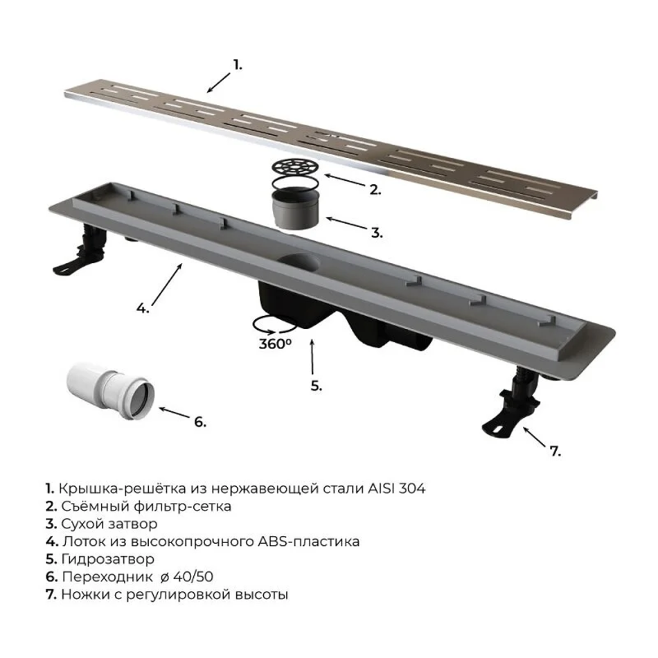 Душевой трап Leo-20 – это сантехническое изделие, созданное для отведения воды из зоны, душевого пространства, выложенное керамической плиткой или мозаикой. Модельный ряд представлен в двух вариантах длины: 60 и 80 см. Трап укомплектован комбинированным затвором гидро+сухой затвор, такая конструкция позволяет на 100% исключить проникновение неприятного запаха в ванную комнату. Решётка выполнена из нержавеющей стали AISI 304, а лоток выполнен из высокопрочного ABS-пластика, такая конструкция обеспечивает максимальную надёжность конструкции более 10 лет. Для эффективного стока воды лоток трапа имеет технический уклон, а для улавливания крупного мусора и волос в конструкцию входит съёмный фильтр-сетка, с помощью которого трап с лёгкостью очищается. В комплектации присутствуют ножки с регулировкой высоты, что позволит с лёгкостью произвести монтаж трапа в пол. Нижний сифон имеет поворотное основание, что позволит подвести сливную трубу с любой стороны. Пропускная способность 40 л/мин.