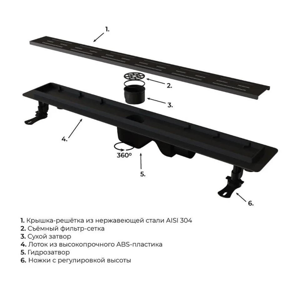 Преимущества трапа Drain Leo 30-60:- Решётка из нержавеющей стали AISI 304- Съёмный фильтр для улавливания волос - быстрый доступ с верху для очистки- Лоток из высокопрочного ABS-пластика- Сливной выпуск 50 мм- Сухой+гидро затвор – 100% защита от неприятных запахов- Две устойчивые опоры с регулировкой высоты (66-89мм) для лёгкой установки- Поворотный сифон для подключения с любой стороны- Установка в один уровень с плиткой- Гидроизоляционная лента в комплекте