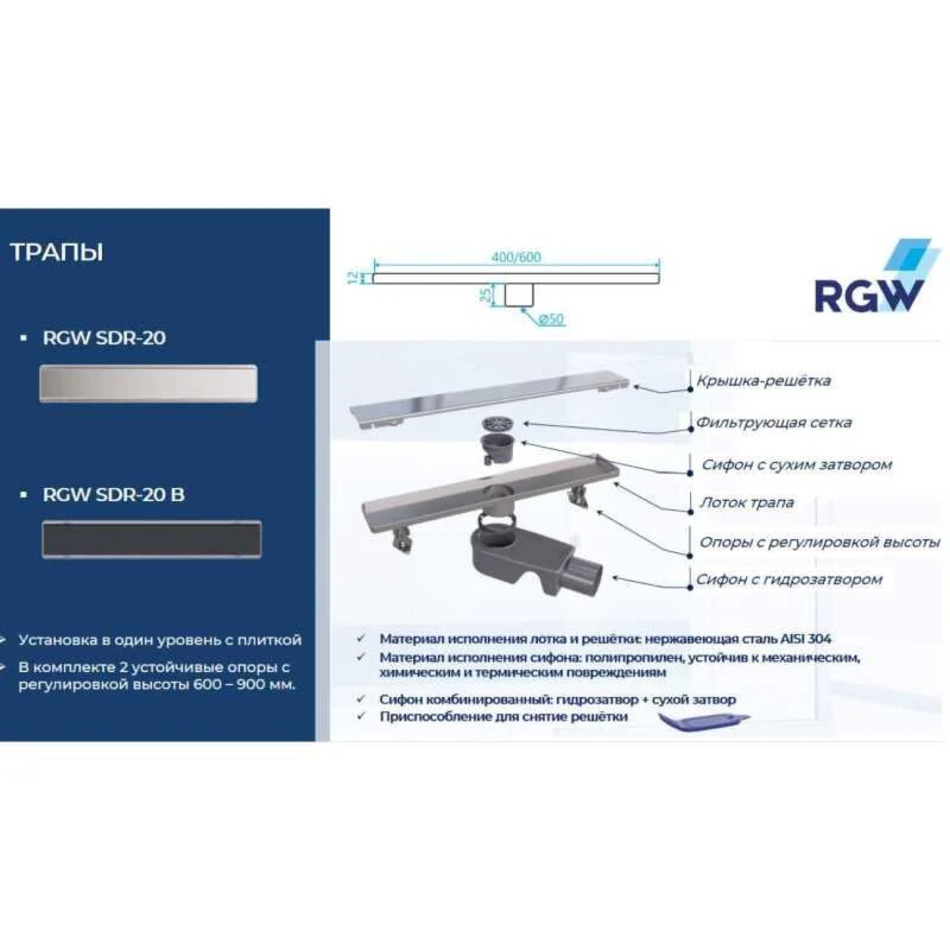 Дренажный канал RGW Shower Drain SDR-20, 60 см, решетка хром, 47212060-01