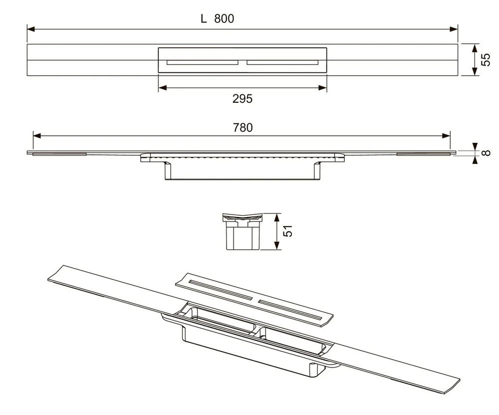 - Душевой профиль, который можно обрезать по длине, выполненный из нержавеющей стали, с уклоном к центру для улучшения слива воды и самоочищения, материал 1.4301 (304)