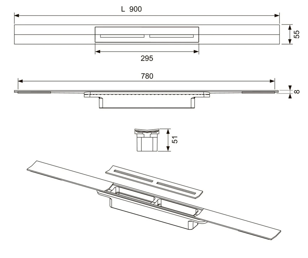 Дренажный канал для душа, для монтажа на плиточный клей над бетонной стяжкой и уплотнением.