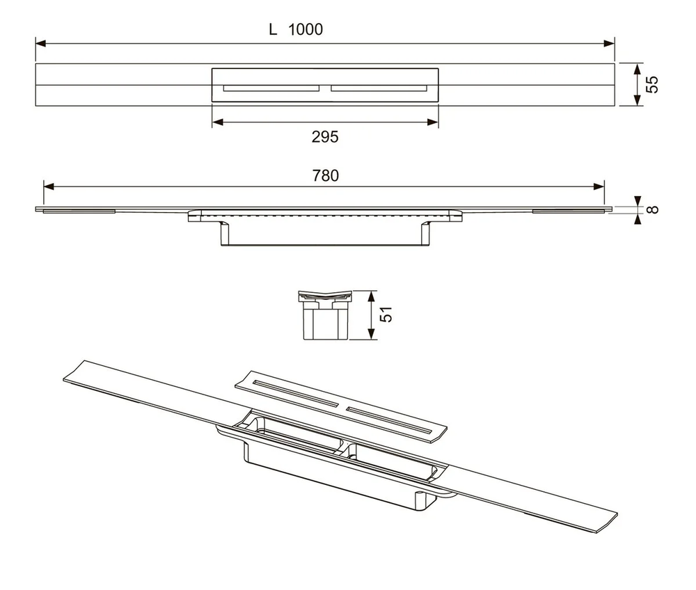 Дренажный канал для душа, для монтажа на плиточный клей над бетонной стяжкой и уплотнением.
