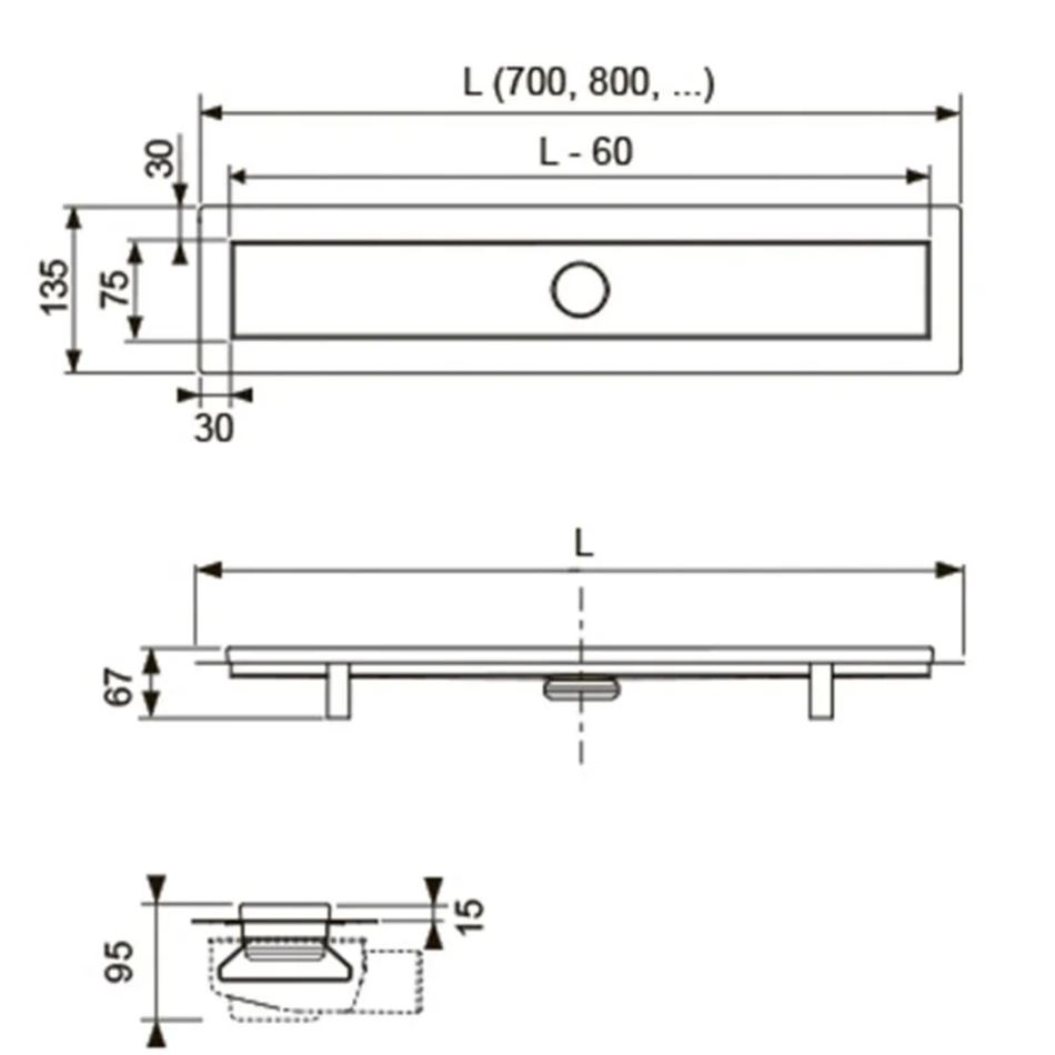 Дренажный канал TECE TECElinus, 70 см, в комплекте с двухсторонней декоративной вставкой (основа для плитки "tile" и панель "steel" брашированная сталь), 15103070