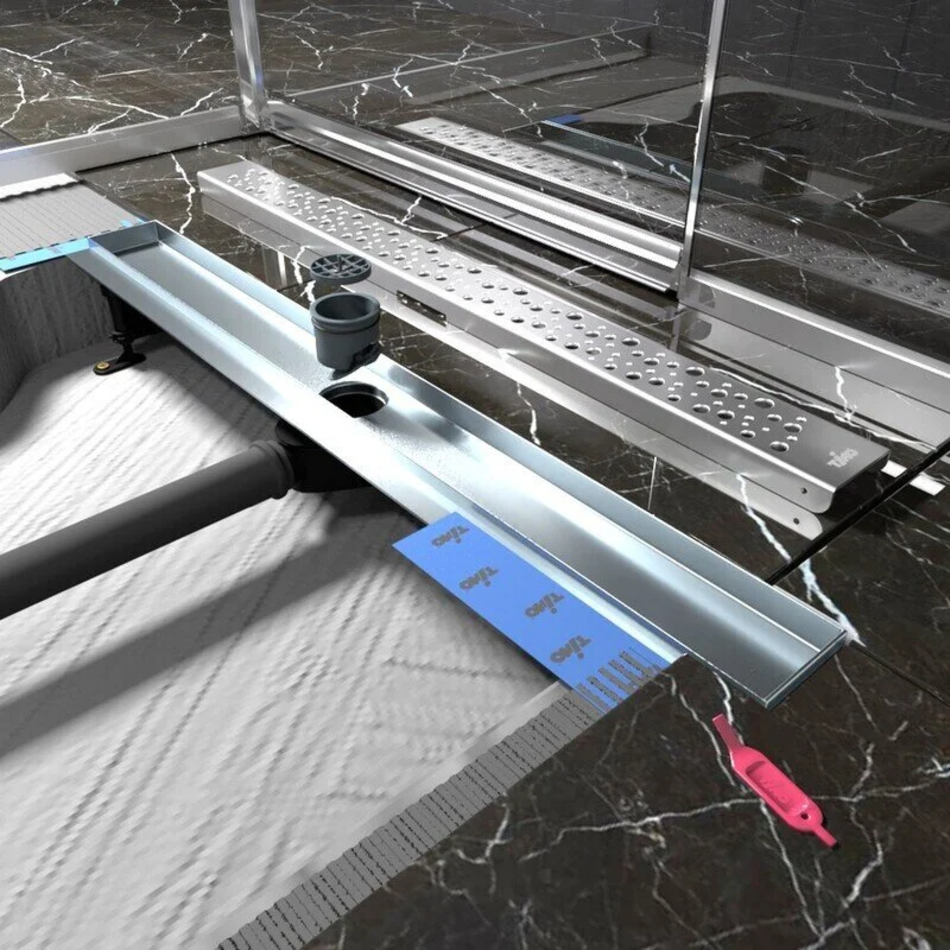 Душевой канал изготовлен из нержавеющей стали, отличающейся большой прочностью и долгой службой. Изделие отлично фиксируется в бетонную стяжку и устойчиво к воздействию агрессивных сред. Самоочищающийся сифон обеспечивает эффективную пропускную способность: 0,7 л/сек при уровне воды 10 мм над решеткой, и 0,8 л/сек - при 20 мм. Уровень гидрозатвора = 25 мм. Сухой затвор гарантирует максимальную защиту от неприятных запахов. Форма канала позволяет создать душевую зону вровень с полом, соблюдая однородный дизайн при этом обеспечивая беспрепятственный отвод воды. Дизайн решетки создает эстетичный эффект, а в двухсторонние декоративные панели можно наклеить вашу плитку. Регулируемые опоры, форма и размерный ряд позволяет использовать канал в любом дизайн-проекте. Сталь с матовой или глянцевой поверхностями гармонично вписывается в пространство пола.