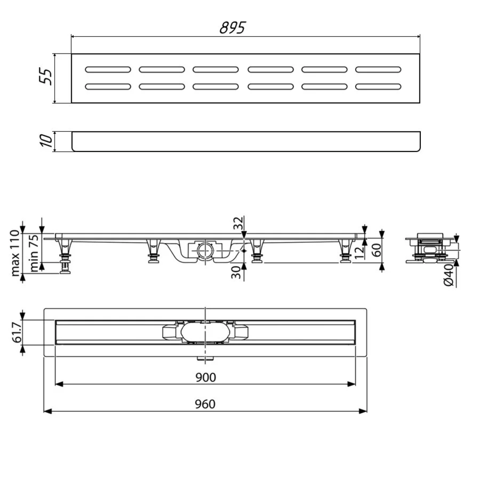 Дренажный канал Timo Eco 90 см, желоб из пластика, перфорированная решетка, хром, DG10-900