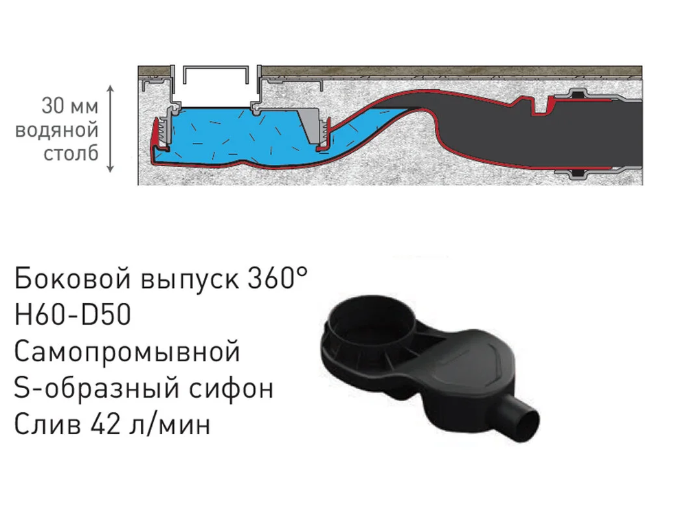 - Горизонтальный выпуск D50 H60, пропускная способность 42 л/мин, монтаж 360°