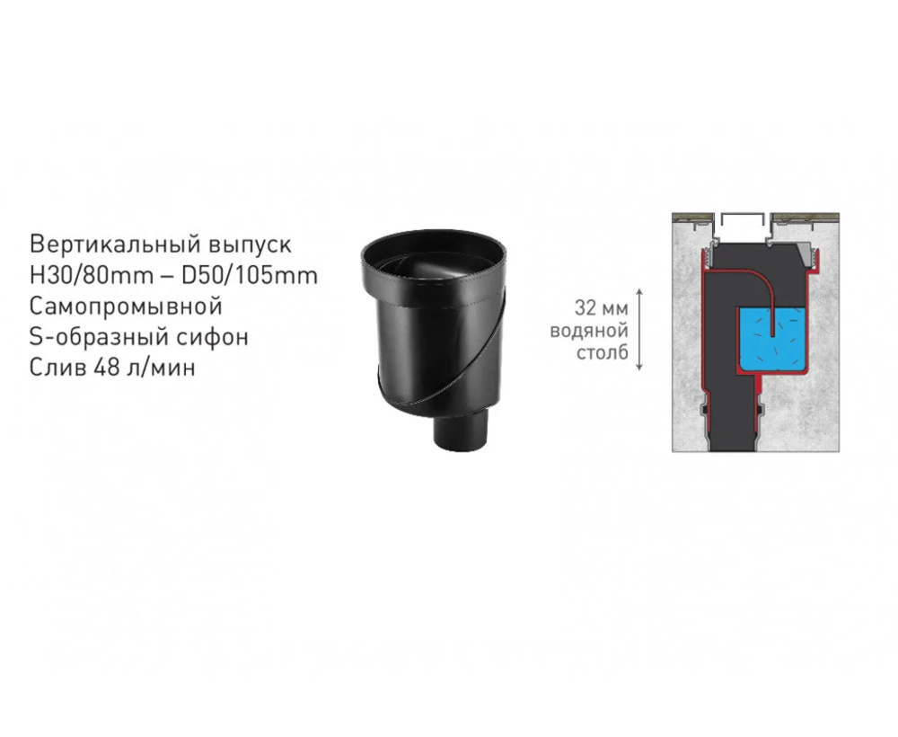 - Вертикальный выпуск D50/105 H50, пропускная способность 48 л/мин, монтаж 360°