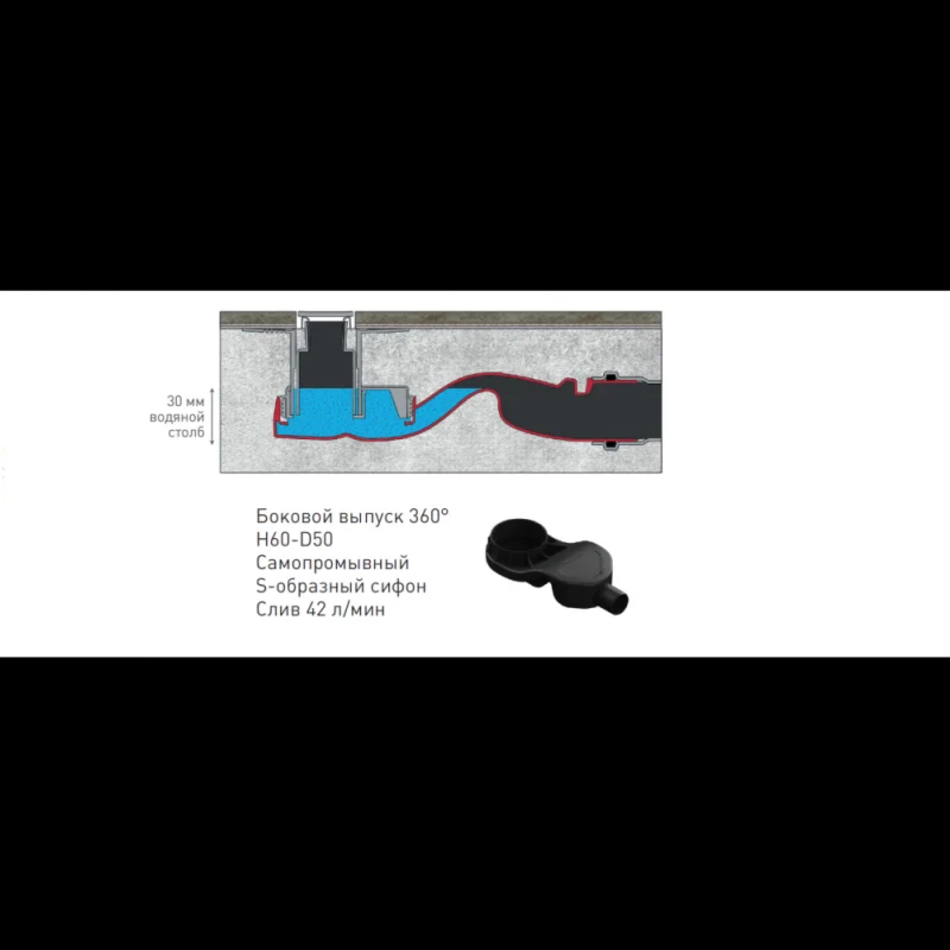 - Самопромывной S-образный сифон PP: горизонтальный выпуск D50 H60, пропускная способность 42л/мин, монтаж 360°