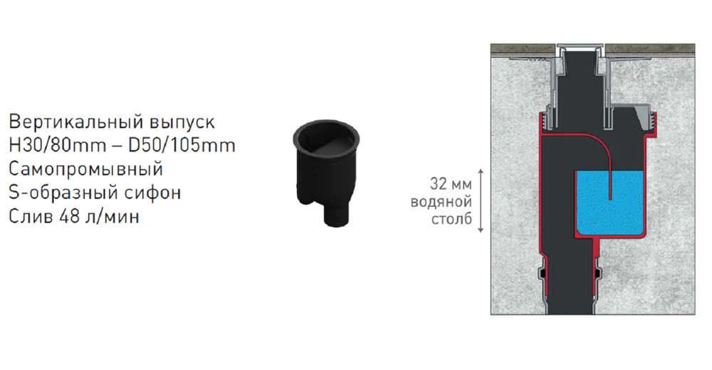 - Самопромывной S-образный сифон PP: вертикальный выпуск D50/105 H50, пропускная способность 42л/мин, монтаж 360°