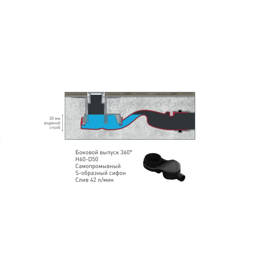 - Самопромывной S-образный сифон PP: горизонтальный выпуск D50 H60, пропускная способность 42л/мин, монтаж 360°