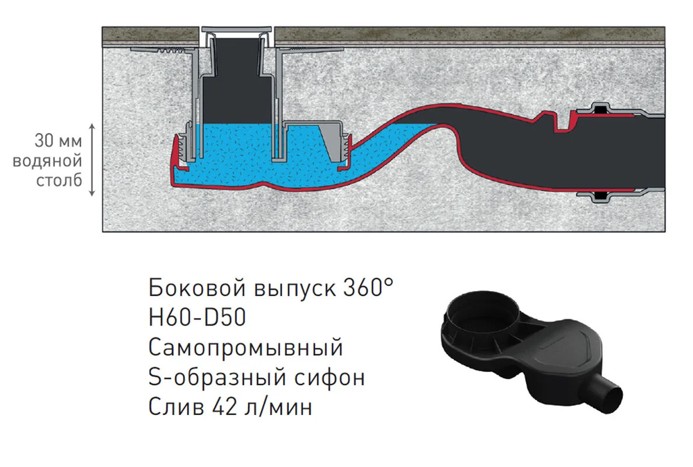 - Горизонтальный выпуск D50 H60, пропускная способность 42л/мин, монтаж 360°
