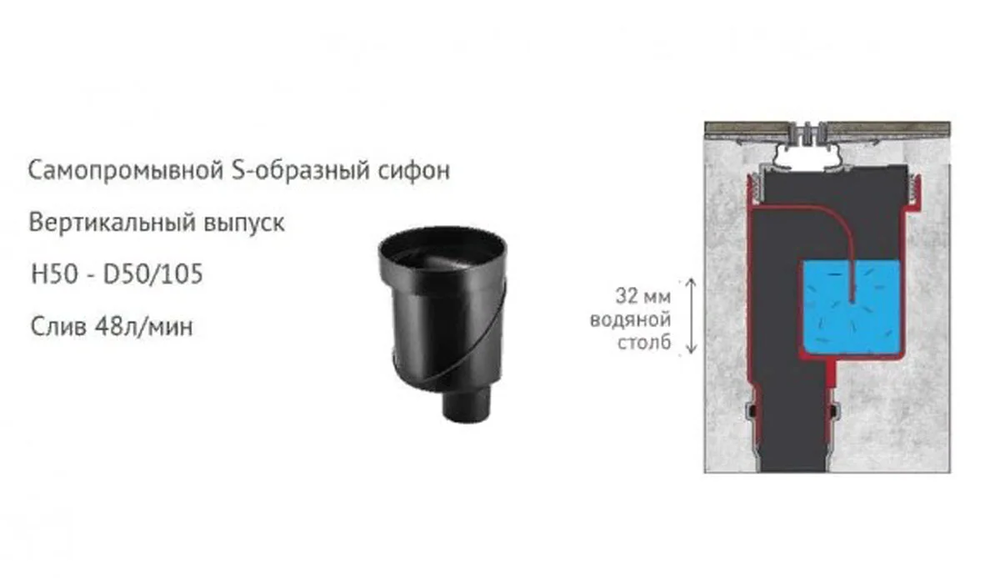 - Самопромывной S-образный сифон PP: вертикальный выпуск D50/105мм H30/135мм, пропускная способность 48л/мин, монтаж 360°