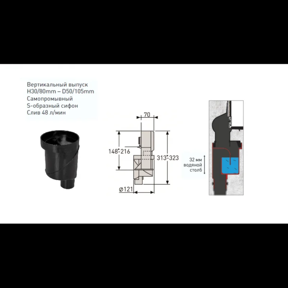- Самопромывной S-образный сифон с переходником PP: вертикальный выпуск D50/105 H50, пропускная способность 48 л/мин, монтаж 360°