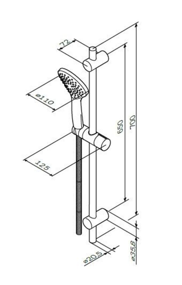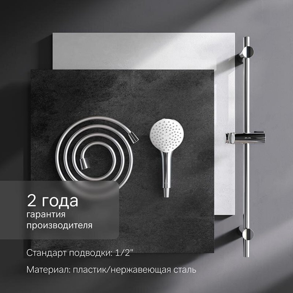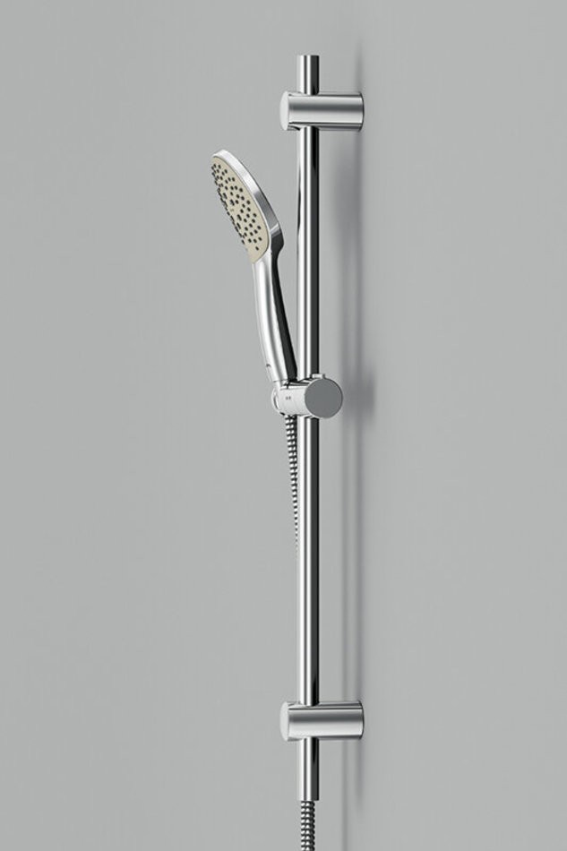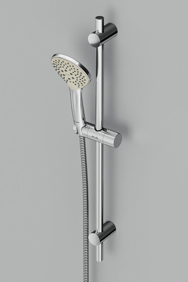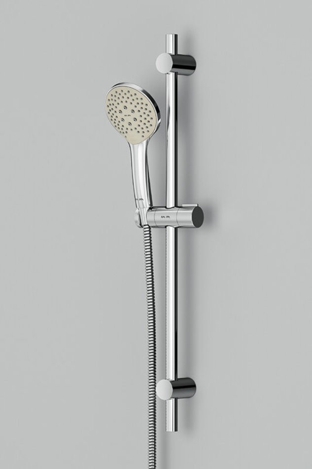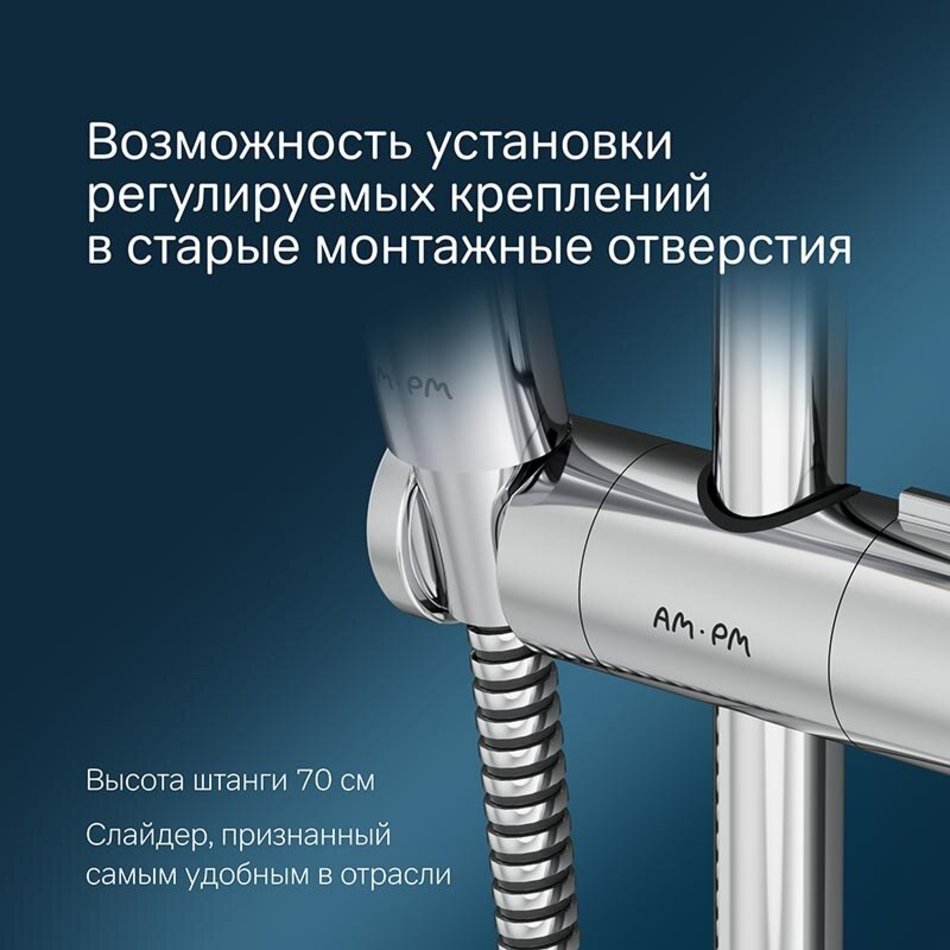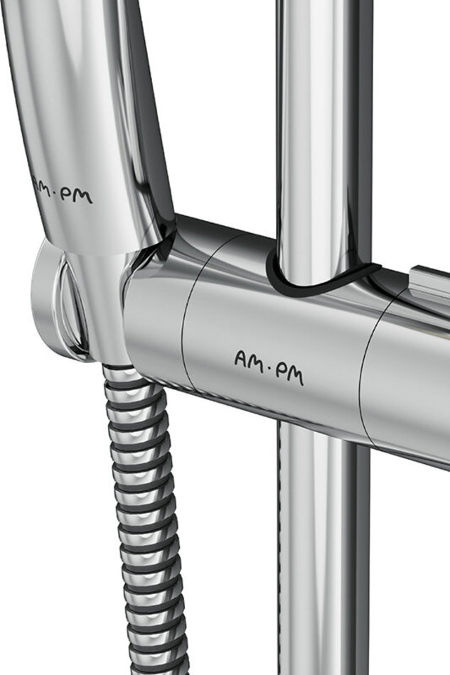 Дизайнерский ручной душ 110 мм (1 режим), душевая штанга 700 мм с функцией vario (возможность установки регулируемых креплений в старые монтажные отверстия), держатель АМ.РМ с механической фиксацией – для фиксации достаточно пол-оборота, душевой шланг 1750 мм с защитой от перекручивания.