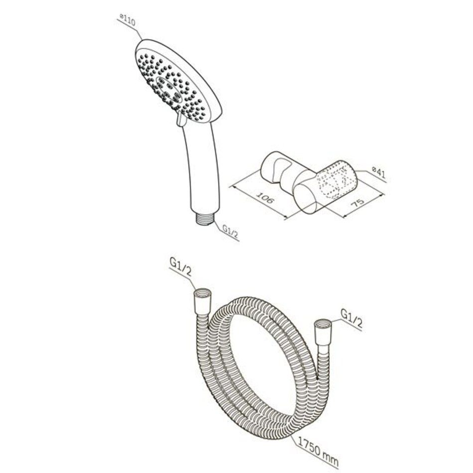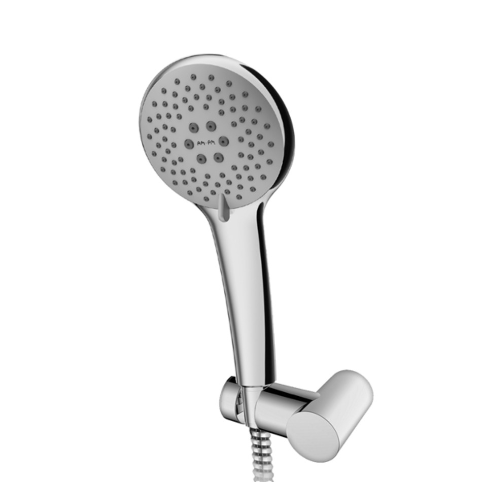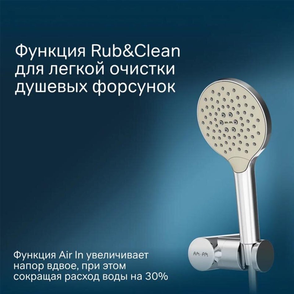 Душевой набор: ручной душ d 110 мм на 3 режима (Spray, EnerJet, Spray + Massage), переключатель режимов Turning Switch, функция Rub&Clean для легкой очистки душевых форсунок, функция Аir In для повышения эффективности и экономии воды, настенный держатель ручного душа, шланг 1750 мм, шарнирное соединение защищает душевой шланг от перекручивания.