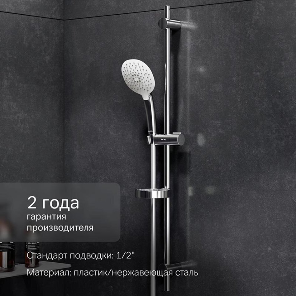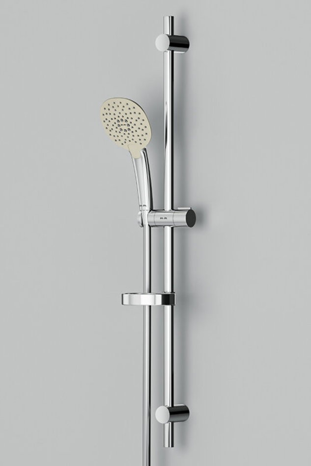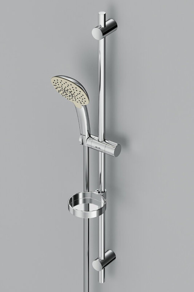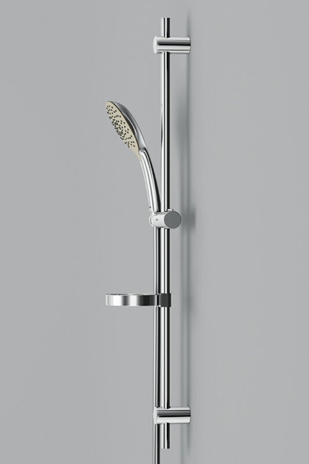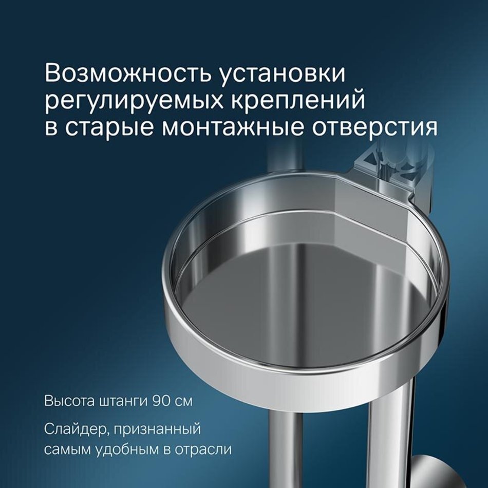 Душевой комплект: душевая штанга 900 мм, душевой шланг 1750 мм, ручной душ 120 мм, мыльница Ø 110 мм, регулируемые по высоте держатели душевой штанги, 3 режима ручного душа (Spray, EnerJet, Spray + Massage), переключатель режимов Simple Switch Push, функция Rub&Clean для легкой очистки душевых форсунок, регулируемый в трех плоскостях держатель ручного душа, шарнирное соединение защищает душевой шланг от перекручивания.