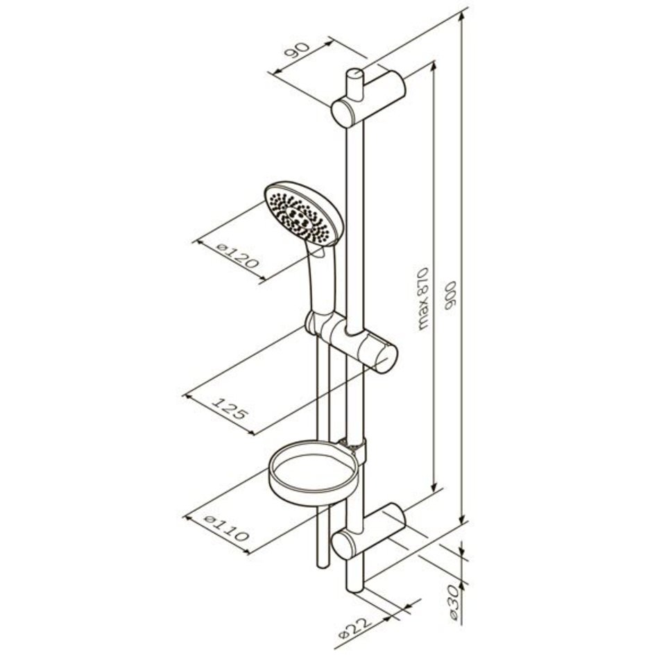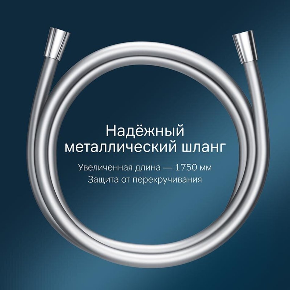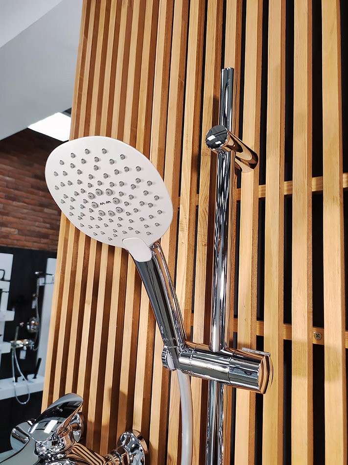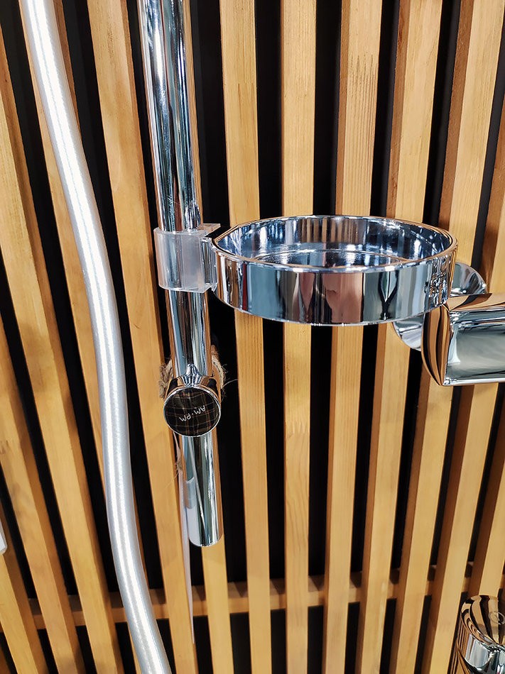Душевой комплект: душевая штанга 900 мм, душевой шланг 1750 мм, ручной душ 120 мм, мыльница Ø 110 мм, регулируемые по высоте держатели душевой штанги, 3 режима ручного душа (Spray, EnerJet, Spray + Massage), переключатель режимов Simple Switch Push, функция Rub&Clean для легкой очистки душевых форсунок, регулируемый в трех плоскостях держатель ручного душа, шарнирное соединение защищает душевой шланг от перекручивания.