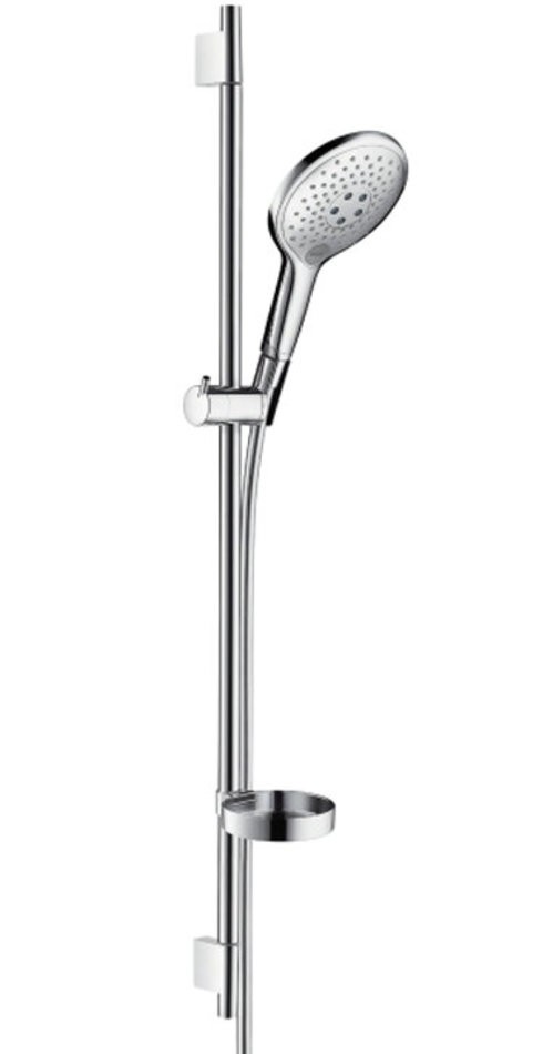 - Ручной душ Raindance Select 1503jet ( арт. 28587xxx ), двухцветная версия с белой внутренней поверхностью душевого диска штанга для душа Unica'S Puro 0,90 м ( арт. 28631000 ) с душевым шлангом Isiflex 1,60 м