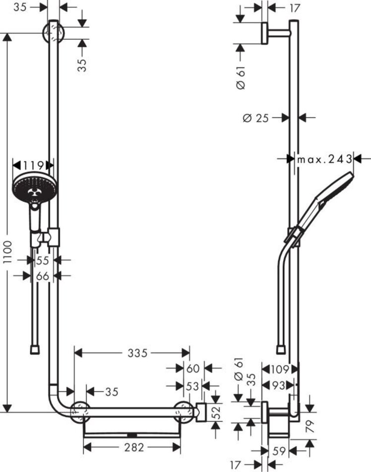 - состоит из: ручной душ, душевая штанга, полочка, шланг для душа, ползунок