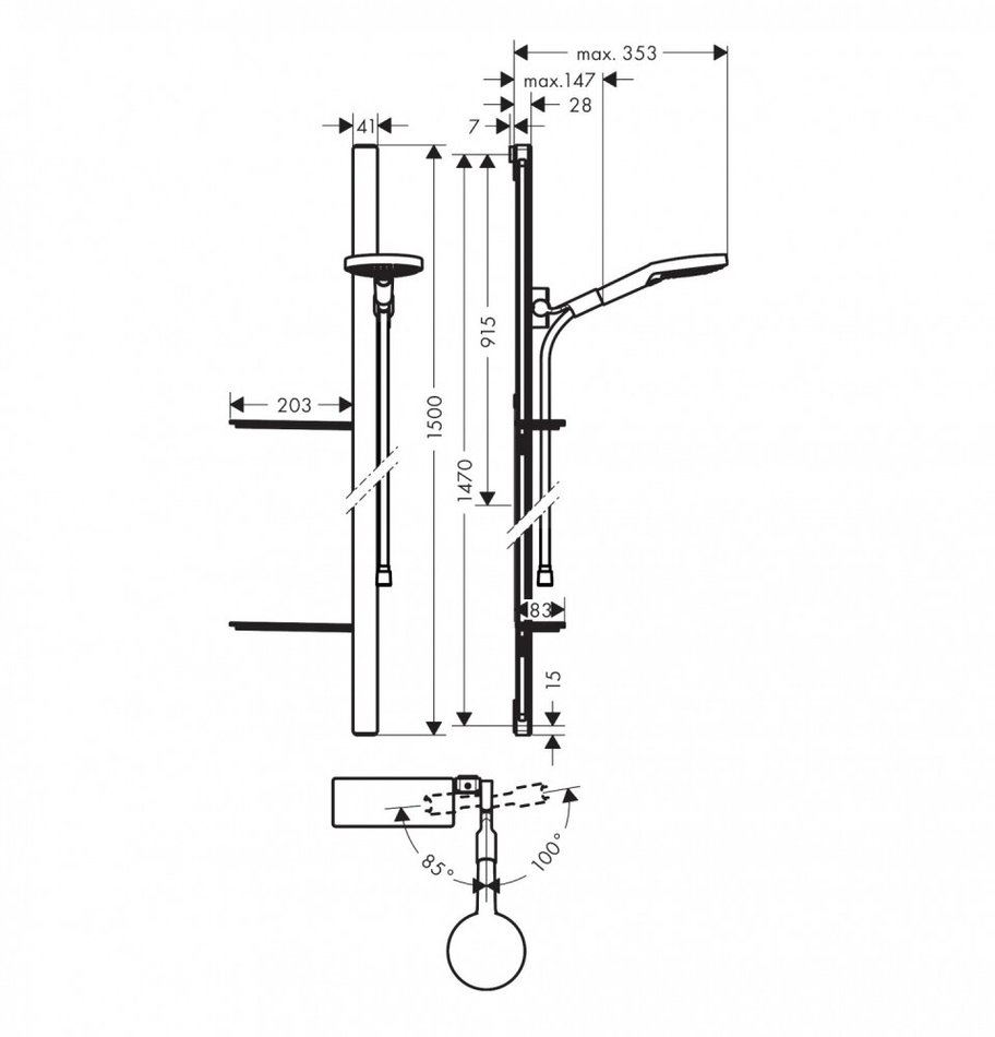 - держатель ручного душа регулируется в пределах 90°, поворачивается вправо и влево, перемещается вверх и вниз