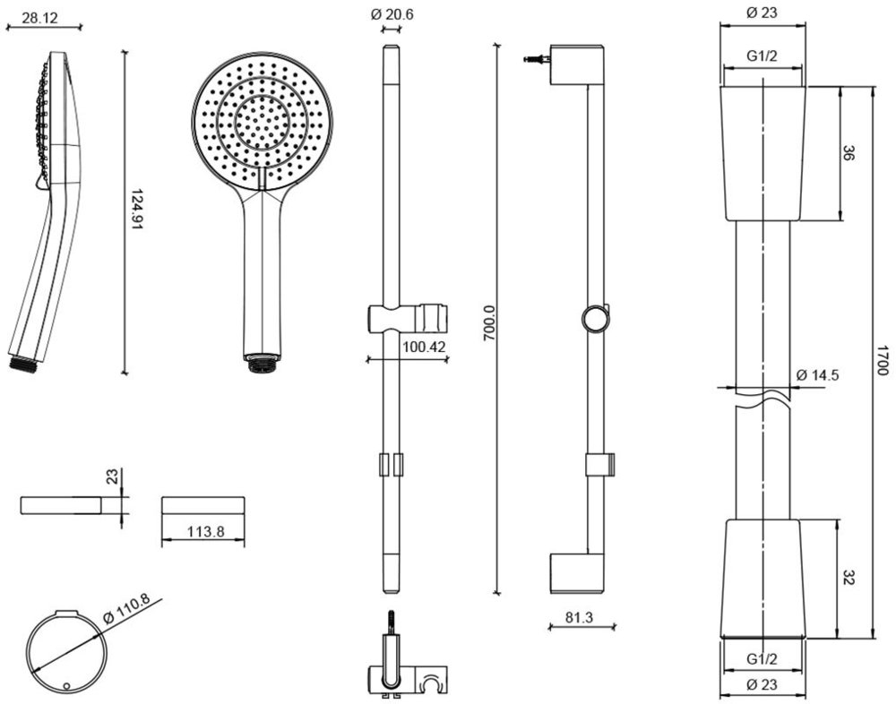 Состав: штанга, шланг, ручной душ 110 мм и 3 режима, мыльница