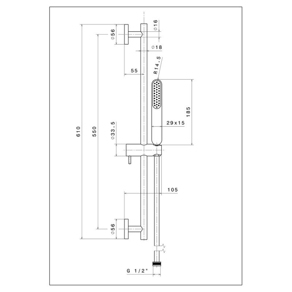 Душевая стойка длиной 150 см с подвижным держателем лейки ручного душа из пластика и шлангом из ПВХ. Без выхода для подачи воды.