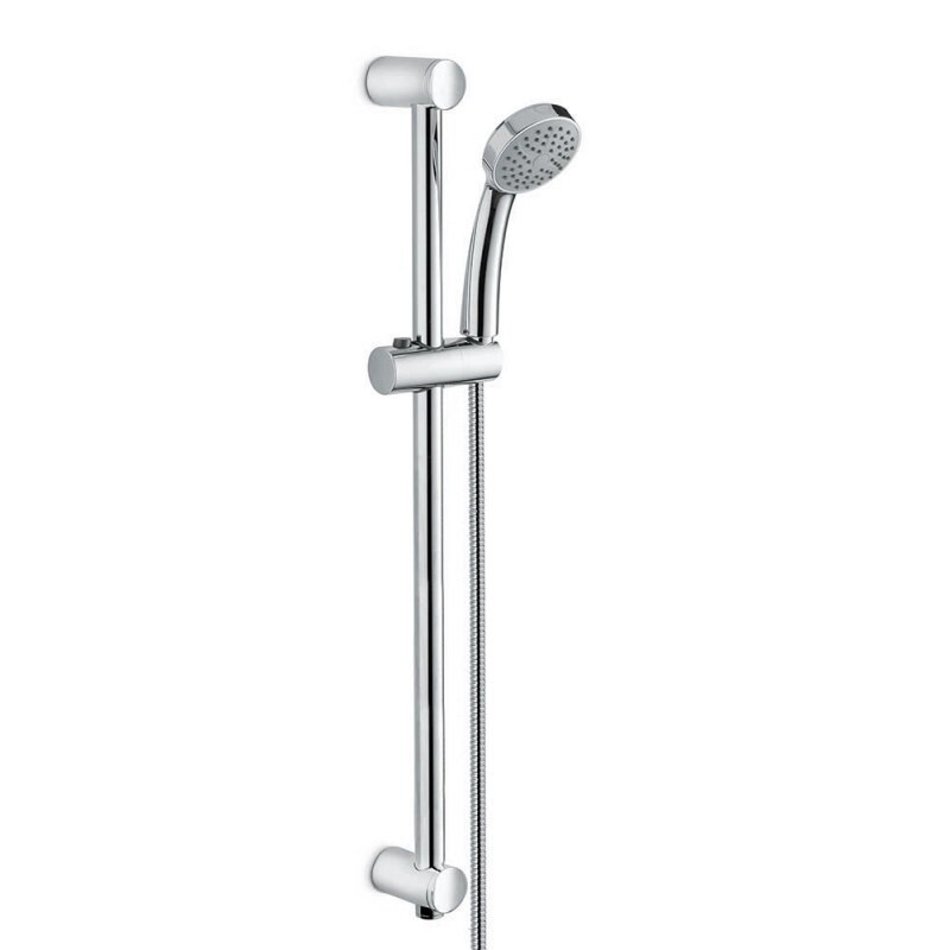 Душевая стойка с подвижным держателем лейки ручного душа из пластика и шлангом из ПВХ. Без выхода для подачи воды.