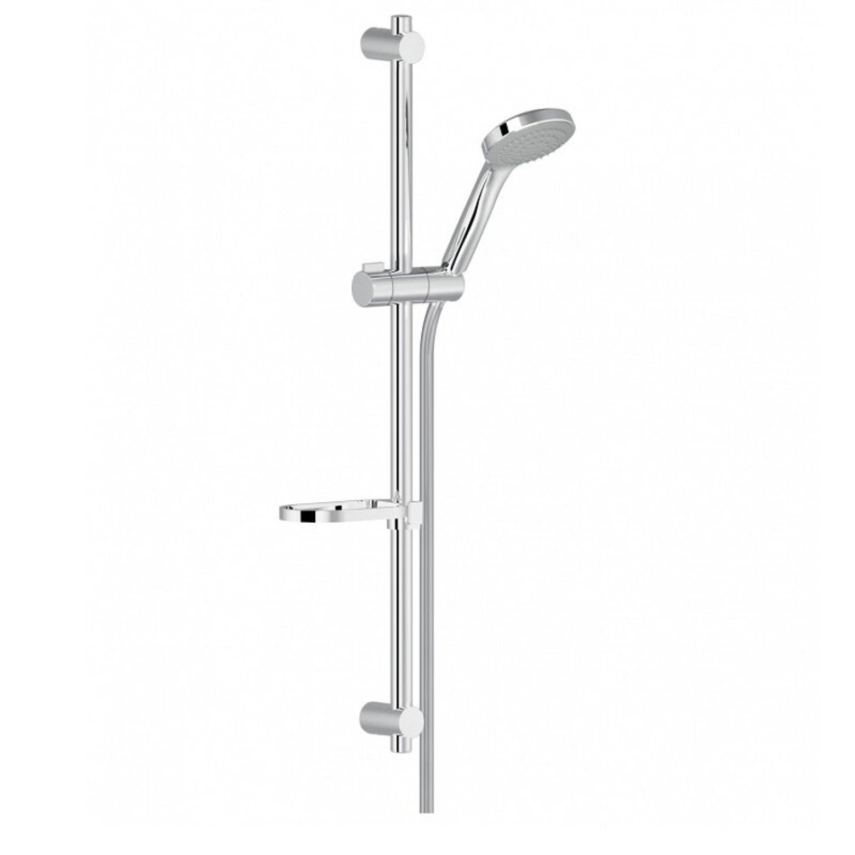 Душевой гарнитур (хром). Скользящий поворотный держатель ручного душа, 1-струйный ручной душ и шланг длиной 150 см, убираемая и регулируемая полка-мыльница.