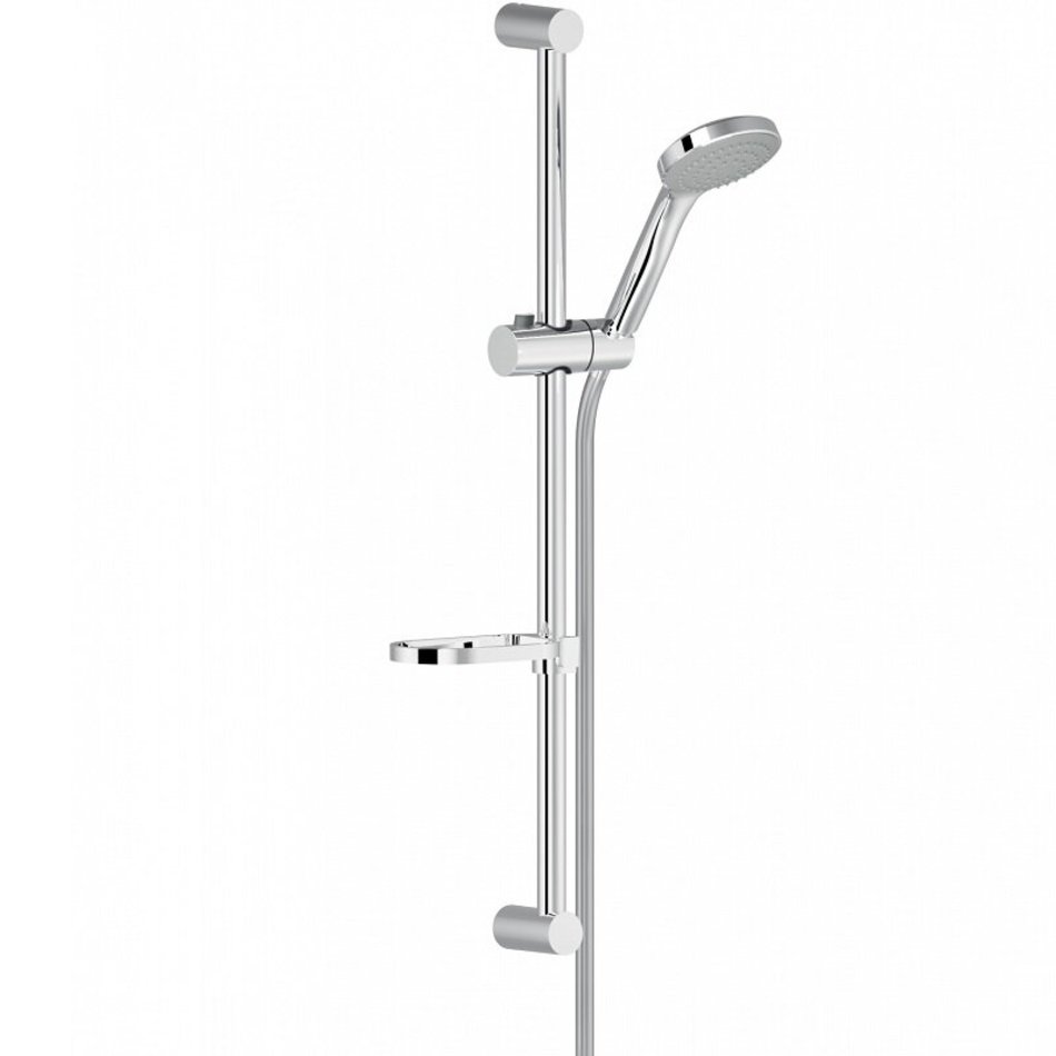 Душевой гарнитур (хром). Скользящий поворотный держатель ручного душа, 1-струйный ручной душ и шланг длиной 150 см, убираемая и регулируемая полка-мыльница.