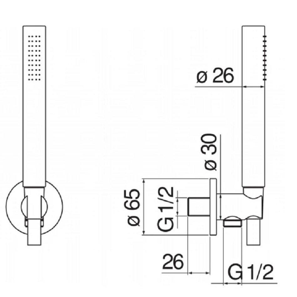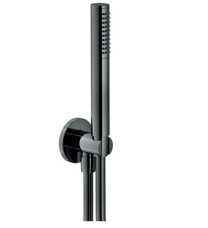 Душевой гарнитур (чёрный): душ с настенным держателем и водозабором. Соединение воды Ø 1/2”. Неподвижный держатель ручного душа. Одноструйный ручной душ. Шланг длиной 150 см.