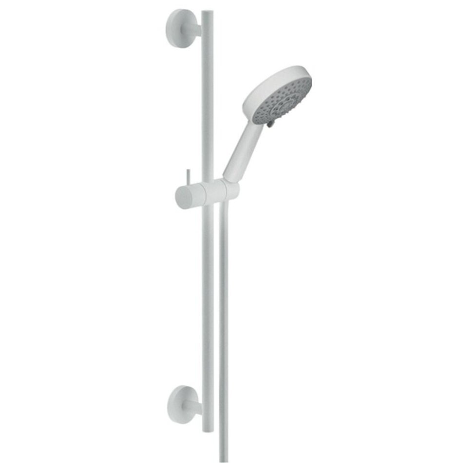 Душевой гарнитур: Штанга 610 мм. Скользящий поворотный держатель ручного душа. 3-струйный ручной душ. Шланг длиной 150 см. Цвет: белый.